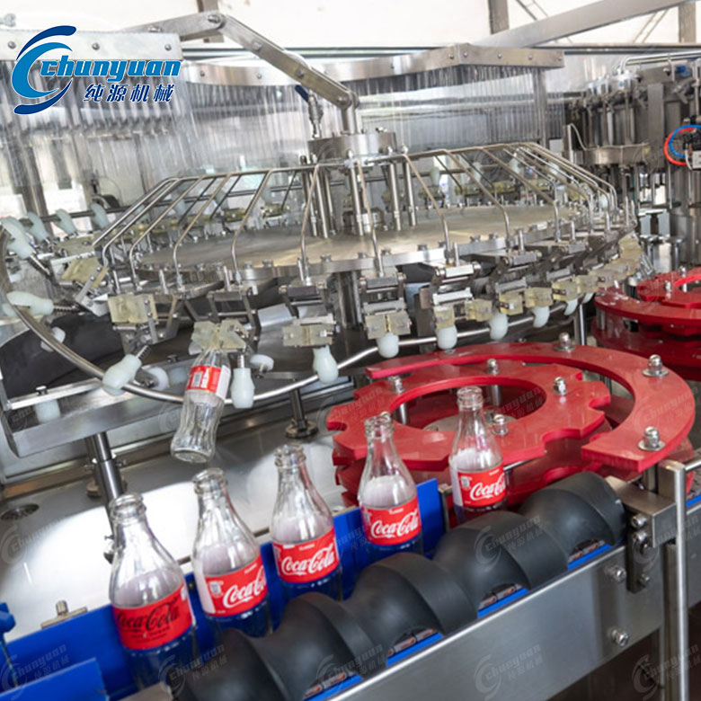 可樂(lè)灌裝機(jī):采用等壓灌裝原理,包括沖洗、灌裝、封蓋等功能,適用于玻璃瓶的灌裝。