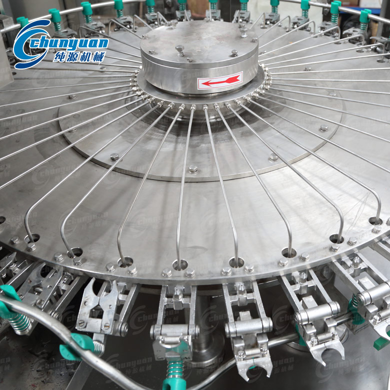 瓶子由通過風(fēng)送道傳遞,然后通過撥瓶星輪傳送至三合一機(jī)的沖瓶機(jī)。沖瓶機(jī)回轉(zhuǎn)盤上裝有瓶夾,瓶夾夾住瓶口沿一導(dǎo)軌翻轉(zhuǎn)180°,使瓶口向下。在沖瓶機(jī)特定區(qū)域,沖瓶夾噴嘴噴出沖瓶水,對瓶子內(nèi)壁進(jìn)行沖洗。瓶子經(jīng)沖洗、瀝干后在瓶夾夾持下沿導(dǎo)軌再翻轉(zhuǎn)180°,使瓶口向上。洗凈后的瓶子通過撥瓶星輪由沖瓶機(jī)導(dǎo)出并傳送至