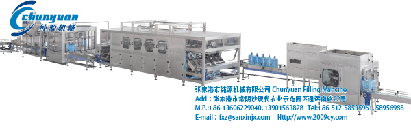 張家港市純源機械研發(fā)制造的CYTZ系列桶裝水灌裝設備集自動洗瓶、自動上瓶、灌裝、套蓋、壓蓋、成品送出于一體。桶裝水灌裝設備適用于灌裝3加侖、5加侖水桶的全自動灌.............