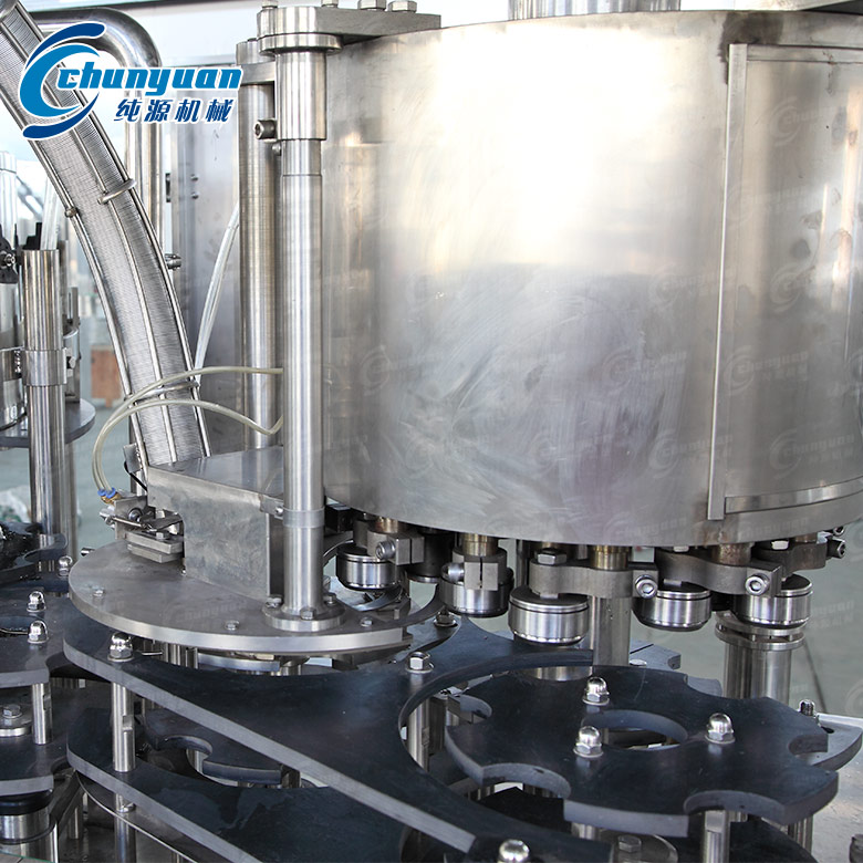 易拉罐椰子汁飲料機(jī)械采用常壓灌裝原理,當(dāng)空罐經(jīng)撥輪進(jìn)入升降托罐盤后,灌裝閥和空罐對中,空罐升起并密封,同時自動打開灌裝閥的閥口,當(dāng)灌裝液面堵住閥的回氣管口時停止灌裝。灌好的罐子經(jīng)鉤子鏈送到封口機(jī)頭,蓋子經(jīng)送蓋器及壓頭把蓋子送到罐口上,當(dāng)托罐機(jī)構(gòu)升起時,壓頭壓緊罐口,封口輪先預(yù)封再實封,罐子封好后被打蓋機(jī)構(gòu)的打頭推出,然后進(jìn)入出罐輸送。